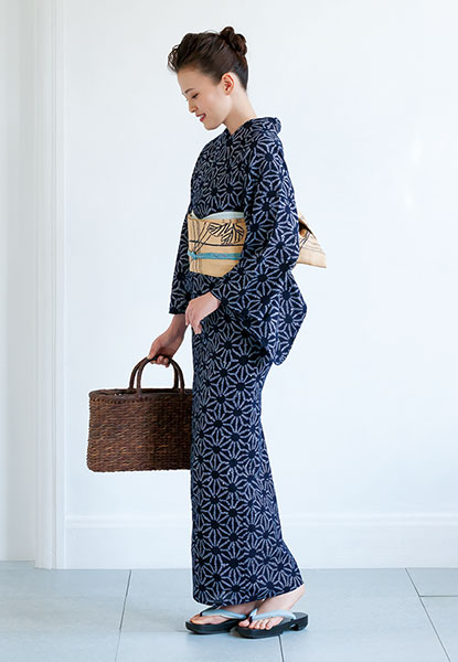 藍(lán)地に麻の葉柄の絞り染め。これは小河さんのお母さまのゆかただそう。帯は蔦模様の麻の著物を仕立て直したもの。素足に下駄、帯は粋な印象の銀座結(jié)びをコンパクトにアレンジして、右ページより砕けた著方です。帯揚(yáng)げ、帯締め、鼻緒を同じ水色で合わせ涼やかにコーディネート。衣紋を抜き、ヘアはすっきりと上げてうなじをきれいに見せています。