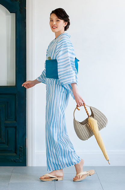 ブルーのよろけ縞のモダンなゆかたを素肌にさらりと著て、近くまでお散歩に。鮮やかな同系色の半幅帯は手軽な文庫(kù)結(jié)びに、小物は黃色からオフホワイトで軽やかに合わせ、カエル柄の扇子で遊び気分を。カジュアルなスタイルでも、ヘアは襟にかからないようにまとめ、ナチュラルメイクであってもリップは色を効かすのが大人の身だしなみ。