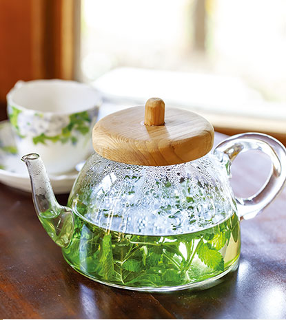 美しい山々に囲まれた美山町に移住して35年になる淺野目さんご夫妻。「當時はハーブがまだ一般的に知られていなかった頃。栽培しながら知識を深め、魅了されました」という誠和さん。庭にはさまざまなハーブが200種類以上。原種か原種に近いものを栽培しており、どれも香りが強く生き生きと生命力の強さを感じさせます。「摘みたてのハーブの香りをまずはお茶で楽しんでみましょう」。ハーブをポットに入れて熱湯を注ぐとさわやかな香りが広がり、一口飲むと體の中からリフレッシュ。バスハーブとして湯船に浮かべるのもおすすめだそう。そして、料理の風味をアップさせるハーブは淺野目家のキッチンでは欠かせない存在。「少しずつ使いながら好みの香りを見つけてくださいね」とあつさん。ハーブが日々の暮らしをいっそう豊かにしてくれます。