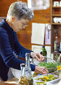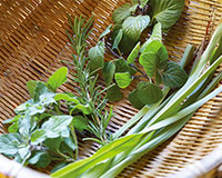 摘みたてのハーブや自家栽培の畑の採れたて野菜を使って、手早く料理を作ってくれた、あつさん。ハーブの香りが加われば、塩?こしょうだけでも、豊かな味わいになります。旬の時期に収穫したハーブは乾燥させたり、酢に漬けておけば年中活躍します。