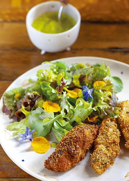 畑で収穫したレタス、マーシュなどの葉野菜にナスタチウム、ボリジの花を散らしたサラダは見た目もすてき。