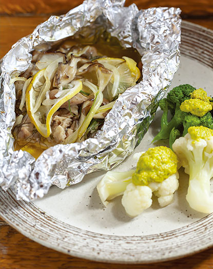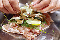 鶏むね肉にローズマリー、フェンネル、チャイブなどのハーブとレモン、きのこをのせホイルに包んで、オーブンで焼く。
