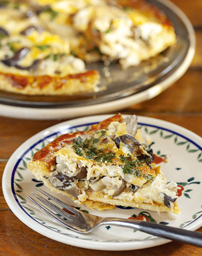 きのこはタイムやフェンネルなどのハーブを加えて炒め、タルト生地に入れる。