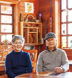 ハーブ研究家でネイチャーガイドの誠和さんとあつさんご夫妻。手作りのログハウスではハーブティーとともに季節のケーキが楽しめ、地元の作家さんの作品やあつさんの草木染め、誠和さんの家具などの木工作品が並ぶカフェ&ギャラリーになっている。