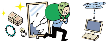 忘れがちな補償內容が、盜難や水濡れ、破損です。例えば、盜難の建物の補償では、「空き巣に入られて窓ガラスを割られた」、家財の補償では「お金や家財を盜られた」「マンションの駐輪場に置いていた自転車を盜まれた」などの被害も補償してくれます。また「洗濯機の蛇口から水が漏れた」「上階の部屋から水が漏れてきた」などで建物や家財が水浸しになるなどの水濡れが補償の対象になっているものもあります。