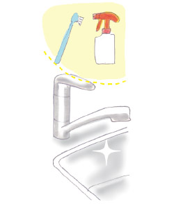 キッチンや洗面所などの蛇口周りにつく白っぽい汚れは、水道水に含まれるミネラル分が固まった水あか。アルカリ性の汚れなので、クエン酸水をスプレーして拭き取りましょう。また蛇口の付け根や裏側によく見られる黒い汚れはカビ。古歯ブラシに重曹をつけてこすり、水で洗い流します。いずれも仕上げにから拭きをしてピカピカに磨いておくと、空間が明るく清潔に見えます。