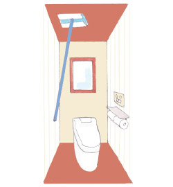 天井にたまったホコリはフロアワイパーを使ってお手入れを。照明器具や換気扇は外せる部分は外して水洗いをし、外せない部分は水拭きをしておきましょう。壁の黃ばみや臭いは尿の飛び散りが原因。クエン酸水を使って拭き取りましょう。また、カビの発生しやすいタオル掛け周りなどは、除菌のため、定期的に消毒用エタノールでお手入れしておきましょう。いずれも壁が傷まないかチェックしてから行いましょう。