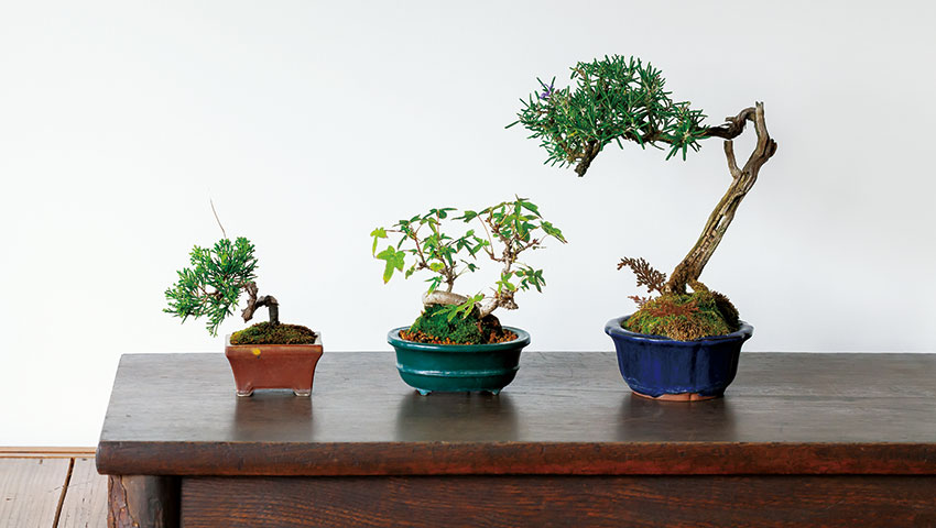 左から、ピンと伸びた枯れ枝で生命力を表現したシンパク。四季の移り変わりを楽しめるカエデ。幹の表情が味わい深い古木のローズマリー。形も樹種もさまざま。