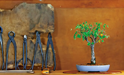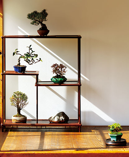 「盆栽は太陽の光や風が大好き。庭やベランダなどで育て、室內に置きっぱなしにしないこと」と久実子さん。特に蒸し暑い夏は要注意。長時間の外出で水をやれないときは日陰へ。帰宅してから室內に飾って楽しみます。