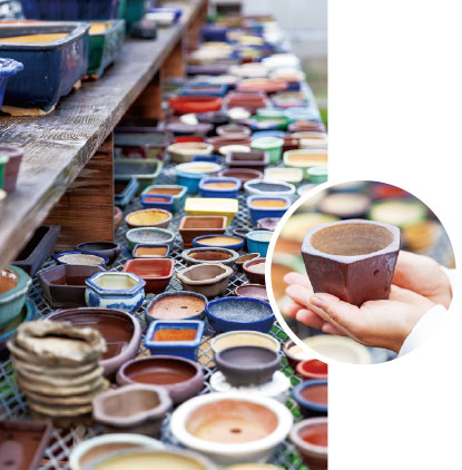 盆栽にとって鉢は大切な要素。「その植物に合った鉢を合わせることで、唯一無二の盆栽になります」と久実子さん。大きさや形、色など多くの種類があり、また骨董や現代作家ものなどによっても雰囲気が変わります。ライフスタイルや飾る場所も考慮して、お気に入りの鉢を選びましょう。