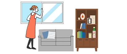 家具は空気の出入り口となる窓や換気口をふさがないように配置。ソファやテレビボードなど大きな家具のまわりは、少し間隔を空け、空気の通り道を確保しましょう。モップが入るぐらいの隙間をつくっておけば掃除もスムーズです。定期的に窓を開けて換気し、ホコリや濕気を外に排出しましょう。