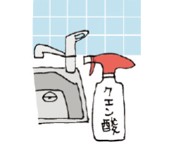浴室の頑固な水あかやトイレの黃ばみなどには酸性の洗剤を直接付け、しばらくおいて洗い流します。水道の蛇口やキッチンのシンクの水あかにはクエン酸水をスプレーして拭き取ります。
