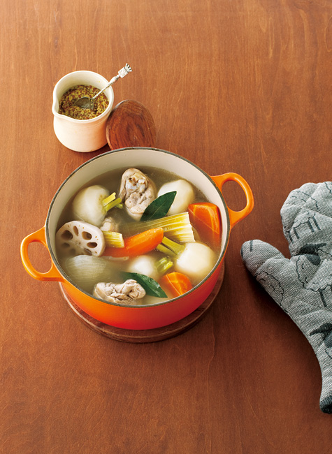 寒くなってくると、溫かな煮込み料理が戀しくなります。ポトフは「火にかかった鍋」という意味を持つフランスの家庭料理。大地の恵みを含んだ根菜と骨付きの鶏肉をポトフ風(fēng)に煮込んだスープは素材の旨みがたっぷり。塩だけで味つけした、シンプルでやさしい味わいが體にじんと染みて溫まります。