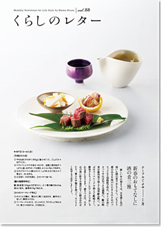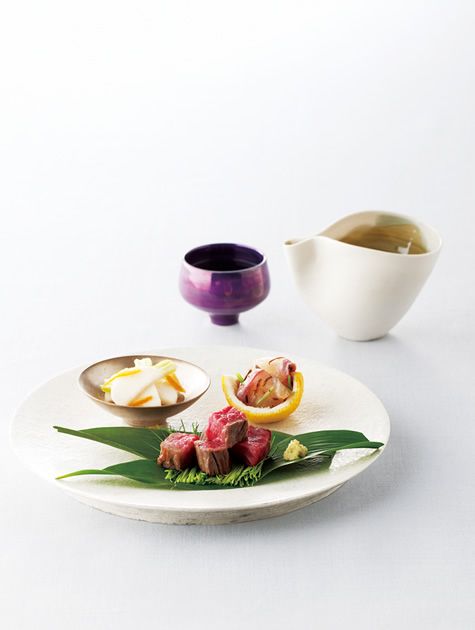 新しい年の始まりは、日本酒と気の利いた酒の肴でおもてなし。ごちそう感のある牛肉のたたきも小さめのブロックなら短時間で作れ、サイコロ狀にカットすればおつまみ感覚に。鯛の刺身は塩昆布で和えて昆布締め風に、かぶはマーマレードで和えて風味よく。簡単でもちょっとしたアイデアでおしゃれな肴になります。盛りつけは、大きめの皿に杯を小皿代わりに組み合わせたり、葉らんや柚子を使って、センスよく見せる工夫をしましょう。