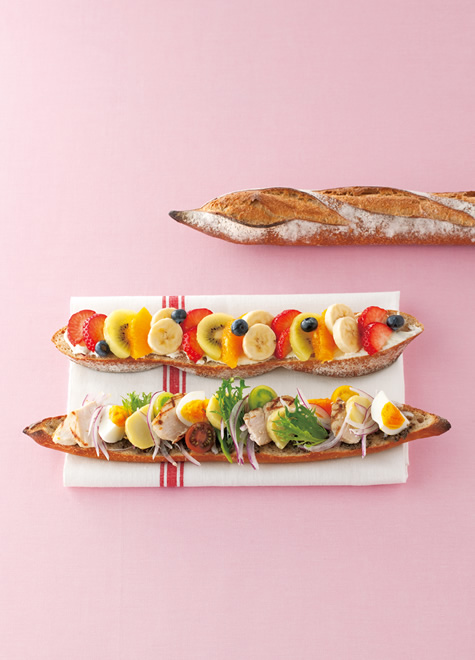 縦半分に切ったバケットに、マスカルポーネ(またはクリームチーズなどのパン用スプレッドやホイップ生クリーム)を塗り、いちご、キウイ、バナナ、オレンジ、ブルーベリーなどお好みのフルーツを彩りよくのせ、全體にはちみつをかける。