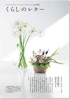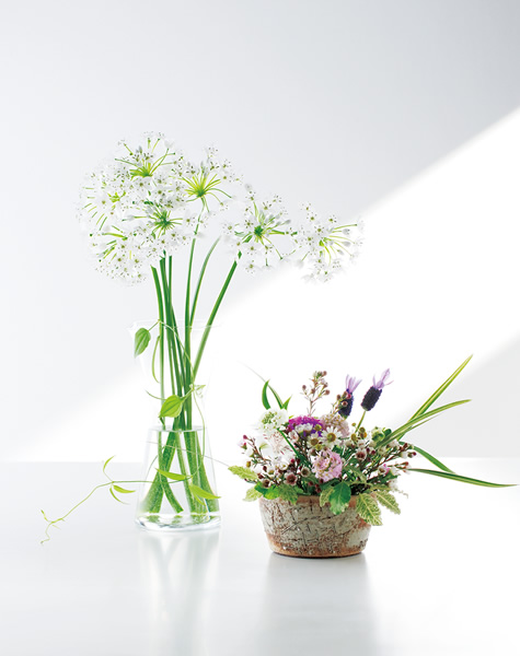 花があると気持ちが元気に、部屋の雰囲気も明るく、きれいに暮らしたいという気分になります。花は花瓶でなくても、身近な器に生けても素敵。例えば、背の高いガラスの水差しには、莖の長い白い花を生け、その莖の表情を楽しみます。つる性のグリーンを1本プラスすると動きが出て軽やかな印象に。庭から摘んできた草花は、溫かみのある陶器が似合います。花の雰囲気に合わせて器を選ぶのも楽しいですね。