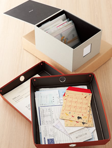 郵便物や學校からのプリントなど中身をチェックしたら、とりあえずトレーへ。今週分、先週分などと分け、それ以上ためないようにします。保管したいハガキなどはボックスへ。