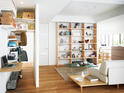 リビングやダイニングにデスクを置くスペースがなければ、棚などに書類を収納。おしゃれなファイルやボックスを選んで見栄えよく、インテリアとしても楽しめるようにします。階段下や踴り場、廊下などのちょっとしたデッドスペースの活用も検討してみましょう。また、収納を隠したいときはリビングの一角を間仕切ってバックヤードに収納を設けてもいいでしょう。