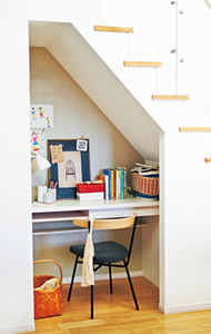 階段下のスペースを活用してデスクを置き、書類整理など事務作業ができるコーナーに。