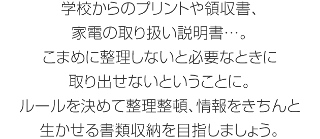 學校からのプリントや領収書、 家電の取り扱い説明書…。こまめに整理しないと必要なときに取り出せないということに。ルールを決めて整理整頓、情報をきちんと生かせる書類収納を目指しましょう。