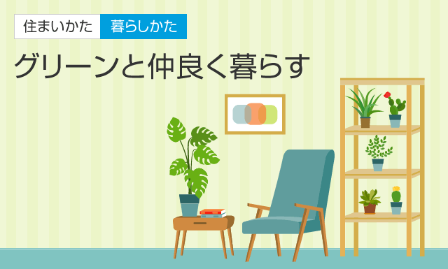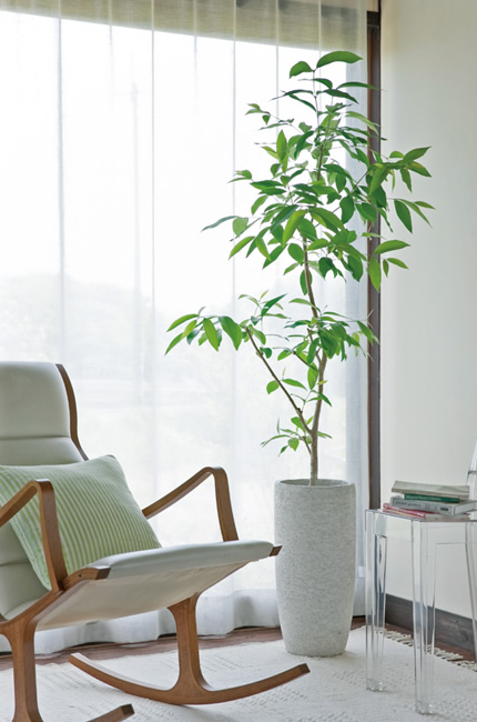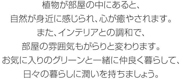 グリーンが部屋にあると、部屋が生き生きとした雰囲気になり、心がほっと安らぎます。インテリアとして大きな役割を果たすと同時に、新芽を出したり、枝がぐんぐん伸びたり、季節によって表情を変えたり…、小さな発見が、日々の暮らしを豊かにしてくれます。グリーンは生きもの。水をやったり、手入れをしながら成長を見守り、家族の一員のように愛情を持って一緒に暮らしましょう。