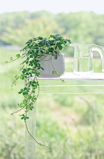 葉の形が愛らしい、つる性の植物「シュガーバイン」。棚の上などにつるが垂れ下がるように置いたり、天板などにはわせたりして、その表情を楽しみます。窓辺やリビングの光がよく當たる場所で育てましょう。