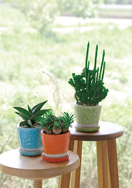 ユニークな形に愛好家も多い多肉植物やサボテン。小さな鉢を複數並べると空間に表情が出ます。比較的乾燥に強く手間がかかりませんが、寒さに弱いので溫かい環境で育てます。寫真右奧グリーンの鉢は「ユーフォルビア オンコクラータ セッカ」、オレンジ色の鉢「ユーフォルビア峨眉山(ガビザン)」、ブルーの鉢「サンスベリア リトルサムライ」。