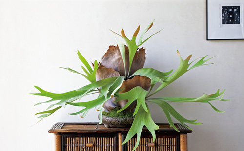 インパクトのあるフォルムが人気の「ビカクシダ(コウモリラン)」。その存在感を生かしてハンギングや壁掛けにして飾られることも多いのですが、寫真のように盆栽風に仕立てると、和の調度にも合います。