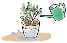 水をやりすぎると根腐れの原因となります。土の表面が乾いたら、鉢底から流れるぐらいたっぷりとやり、根のすみずみまで行き渡らせ、鉢の中の空気も入れ替えます。サボテンや多肉植物など乾燥に強いものもあり、植物によって必要な水の量が違います。葉の様子などを観察して水やりのタイミングをつかみましょう。