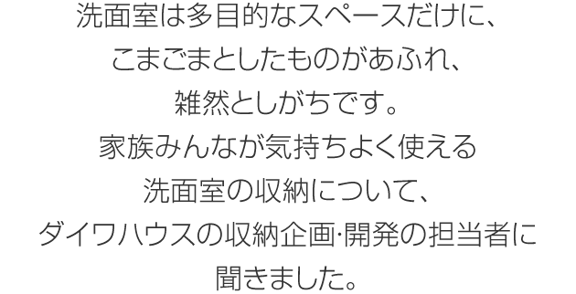 片づかない原因を知って、わが家に合った快適な洗面室の収納をつくりましょう。