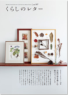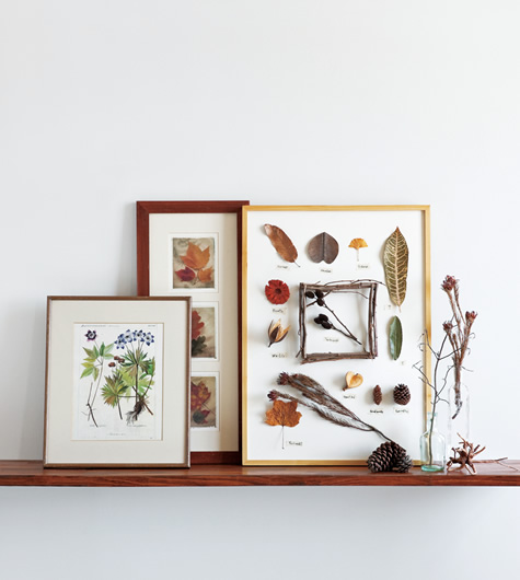 秋が深まると、公園や街路樹の色づく木々を眺めながら歩くのも楽しいですね。散歩の途中で出合った落ち葉や木の実などを観察してみると、自然がつくる形の面白さ、色の美しさに気づかされます。そんな自然の造形美をインテリアに生かして、秋らしいディスプレイコーナーをつくってみませんか。例えば、葉っぱや木の実、小枝などを標本のように額に貼ったり、美しく色づいた葉を撮影してポストカードにして飾っても。一輪挿しのように、ガラス瓶に枝を挿すだけでもアート作品のようですてきです。アーティスティックな気分で楽しんでみましょう。
