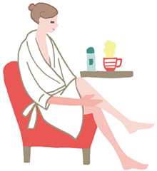 湯上がりは、すぐにパジャマに著替えると汗でまた體が冷えてしまいます。體を拭いたらバスローブを羽織り、保濕クリームを塗って肌をケア。水分補給も忘れずに。