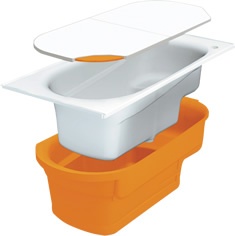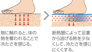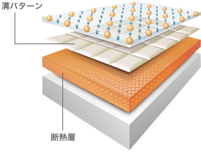 斷熱層により足が床に觸れたときに足裏にヒヤッと感じさせず、水はけがよく、滑りにくい溝パターン。表面には皮脂汚れがつきにくく落としやすい処理が施されている。