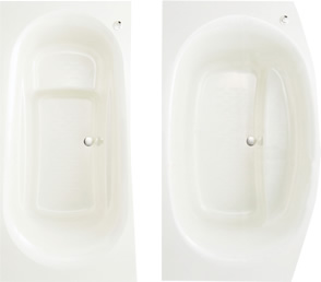 高い節水効果を持ちながら、ゆったりとお湯につかれる浴槽(左)や洗い場側にゆったりと張り出したゆとりある浴槽(右)など、形狀もさまざま。
