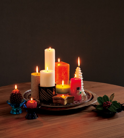 クリスマスの時期になると、さまざまな種類のキャンドルがお店に並びます。高さや形の異なるキャンドルを集めてディスプレイすると、炎の位置や色に変化が出てすてきです。