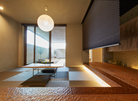畳よりも板の間の高さを少し上げて、おこもり感のある「庵」の趣を演出した和室。低い視線の位置で坪庭バルコニーの景色を楽しめます。獨立した部屋として使いたい時は、プリーツスクリーンを下ろして囲うこともできます。