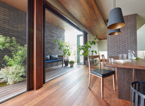 ダイニングとテラスをつなげ、テラスと庭を一枚の壁でゆるやかに隔てた間取り。ダイニングとテラスが一つの空間のように感じられます。カフェのように、ダイニングでお客さまをおもてなししたい方におすすめです。