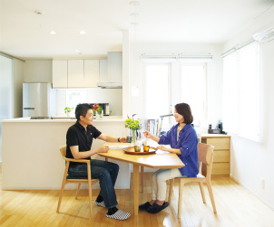 ワンルーム感覚で使える2階のLDKが暮らしのメインステージに。「家族をいつもそばで感じていたい」という妻の規恵さんの希望通り、キッチンにいても、リビングでくつろいでいても、いつもお互いがそばにいる感覚になれる空間です。キッチンに設けた窓は隣地の桜を借景としており、花の時期や緑の季節には目を楽しませてくれます。