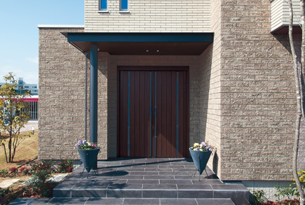 屋外壁に用いる際、建物全體に同じタイルを張るケースもありますが、異なる種類のタイルを張り分けたり、異素材と組み合わせて部分的に張る手法もあります。玄関まわりやバルコニーなど、アクセントを置き、フォーカスしたい部分に用いるのが効果的です。