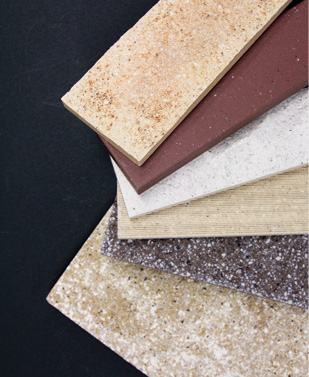 表面にランダムな陰影をつけた割肌タイル「パウザストーン」など、建物の上質感を際立たせる6種類のタイルをラインナップしています。