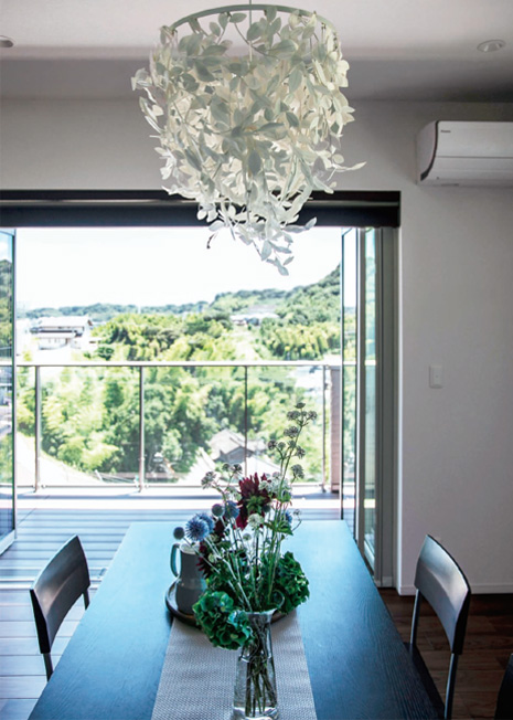 遮るものなく、ひとつながりになった2階のLDKが暮らしのメインスペースです。緑と海、街並みを見渡すことができる大開口の窓。その向こうにはリビングとダイニングから自由に出入りできるバルコニー。長女の悠那(ゆうな)さんがバレエの練習に使えるほど、十分な広さです。腰壁をスケルトンにすることで、より開かれた景色が目に入ります。