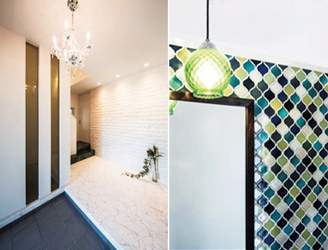 部屋ごとに色の違うアクセントクロスやデザイン性の高い照明を取り入れ、シックな空間に遊び心を加えたコーディネートです。外観は白とダークブラウンのコントラストが美しいシックモダンの雰囲気。