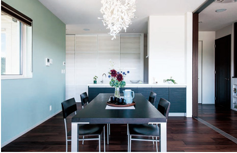 美樹さんが一目ぼれしたシャンデリアとグリーンのクロスがダイニングをナチュラルに演出