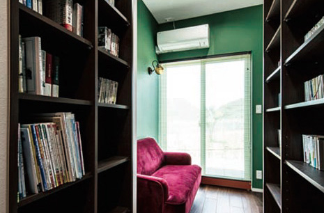 1階の共有スペースに本棚を川の字に配置し、3000冊の蔵書を納めてもなお余裕のあるファミリーライブラリーを設けました。
