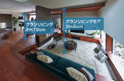 天井高2m72㎝の「グランリビング」からさらに36cm床を下げ、3m8cmという天井高を?qū)g現(xiàn)した「グランリビングモア」。