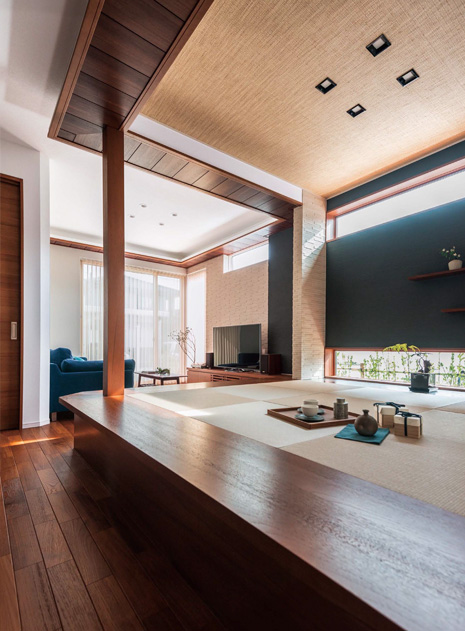 小上がりになったタタミコーナーは、ちょっと腰掛けるのにちょうどいい約40㎝の高さです。壁はリビングと一體感をもたせ、エコカラットタイルと、ダークな塗り壁で構(gòu)成しました。刷毛目の幅にまでこだわったデザインに、2段の飾り棚や高窓、地窓がバランス良く並びます。