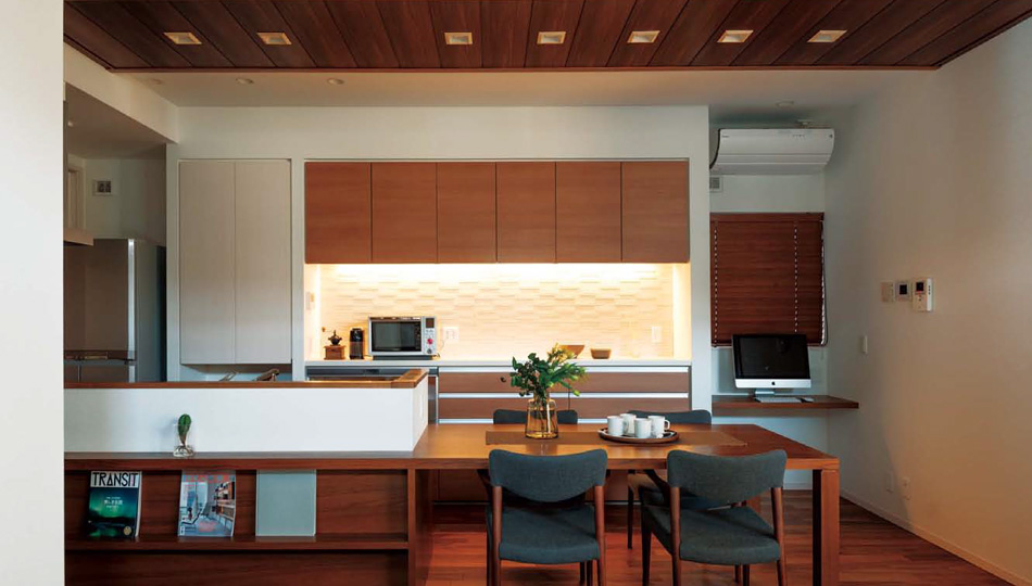 水平ラインを意識してデザインしたダイニングキッチン。背面収納には間接照明を取り入れました