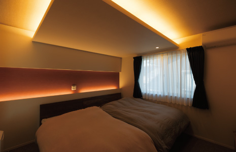 主寢室は天井を下げて落ち著いたインテリアに。ヘッドボードを兼ねた壁の凹みには、彩子さんの選んだ赤のアクセントクロスが