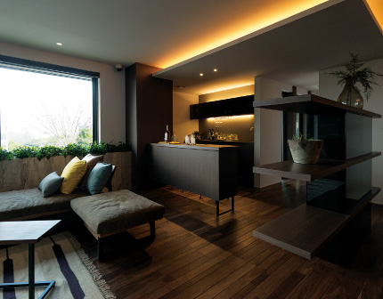 バーカウンターなど落ち著き感を演出したい場(chǎng)所は、折り下げ天井を採(cǎi)用するのもおすすめです。アクセントになる上、周囲との天井高の差を利用して間接照明を入れると、部屋全體が柔らかい光で満たされ天井面がすっきりとした印象に。