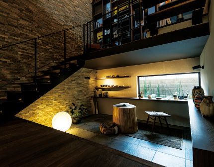 階段下のスペースを土間として活用し、趣味に打ち込める空間にしてはいかがでしょうか。天井高を1m90㎝に抑え重心を低くすることで、コンパクトで落ち著いた雰囲気になります。